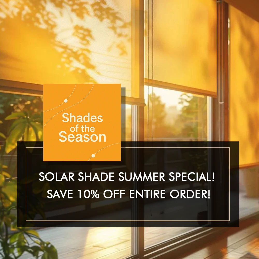 Beat the summer with 10% off your entire order of solar shades – an energy efficient window treatment perfect for blocking glare and keeping interiors cool.